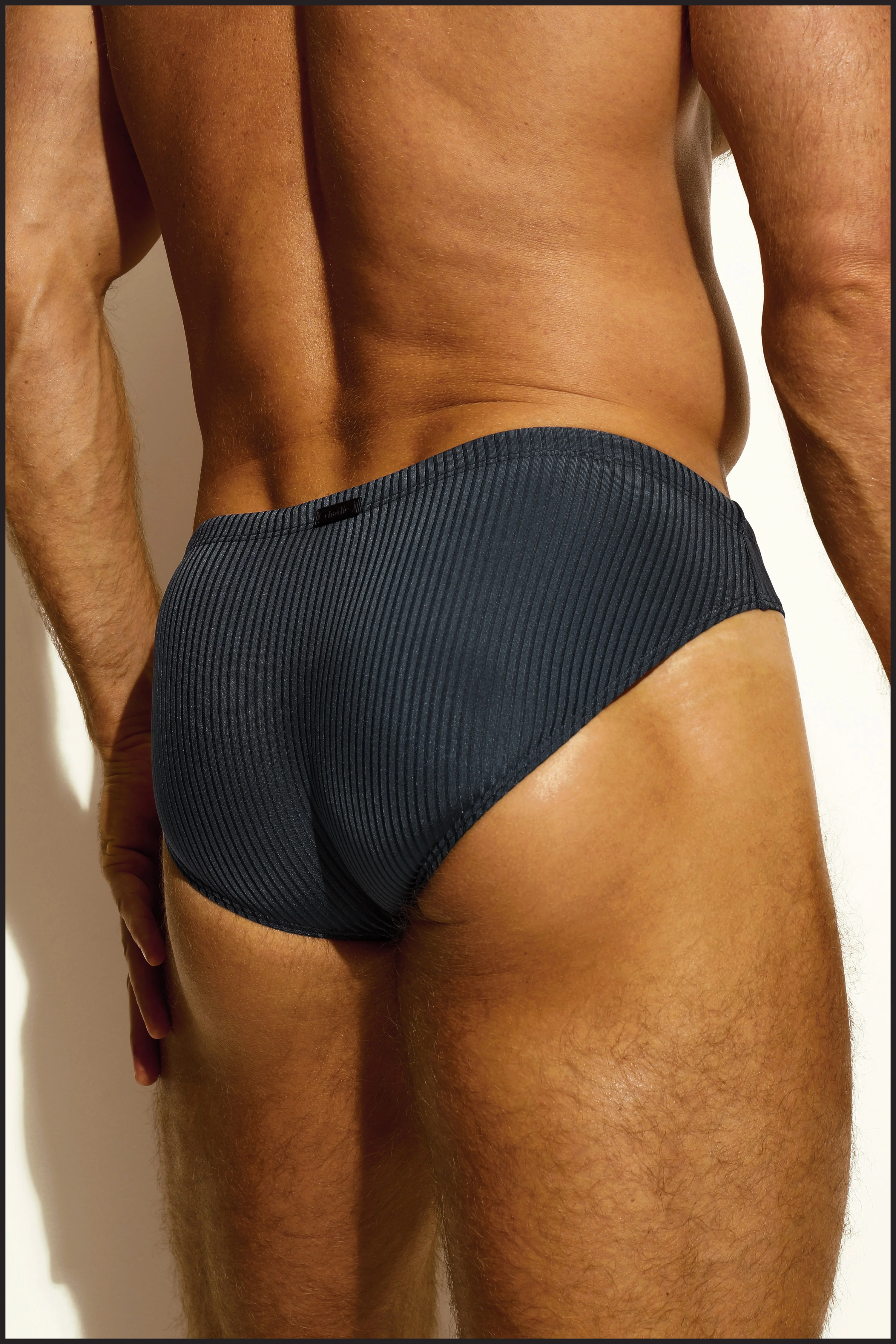 Charlie by Matthew Zink Deep Ocean Italian Wide Rib lowrise swim brief with inside drawstring waistband, and black metal label. Front lined.