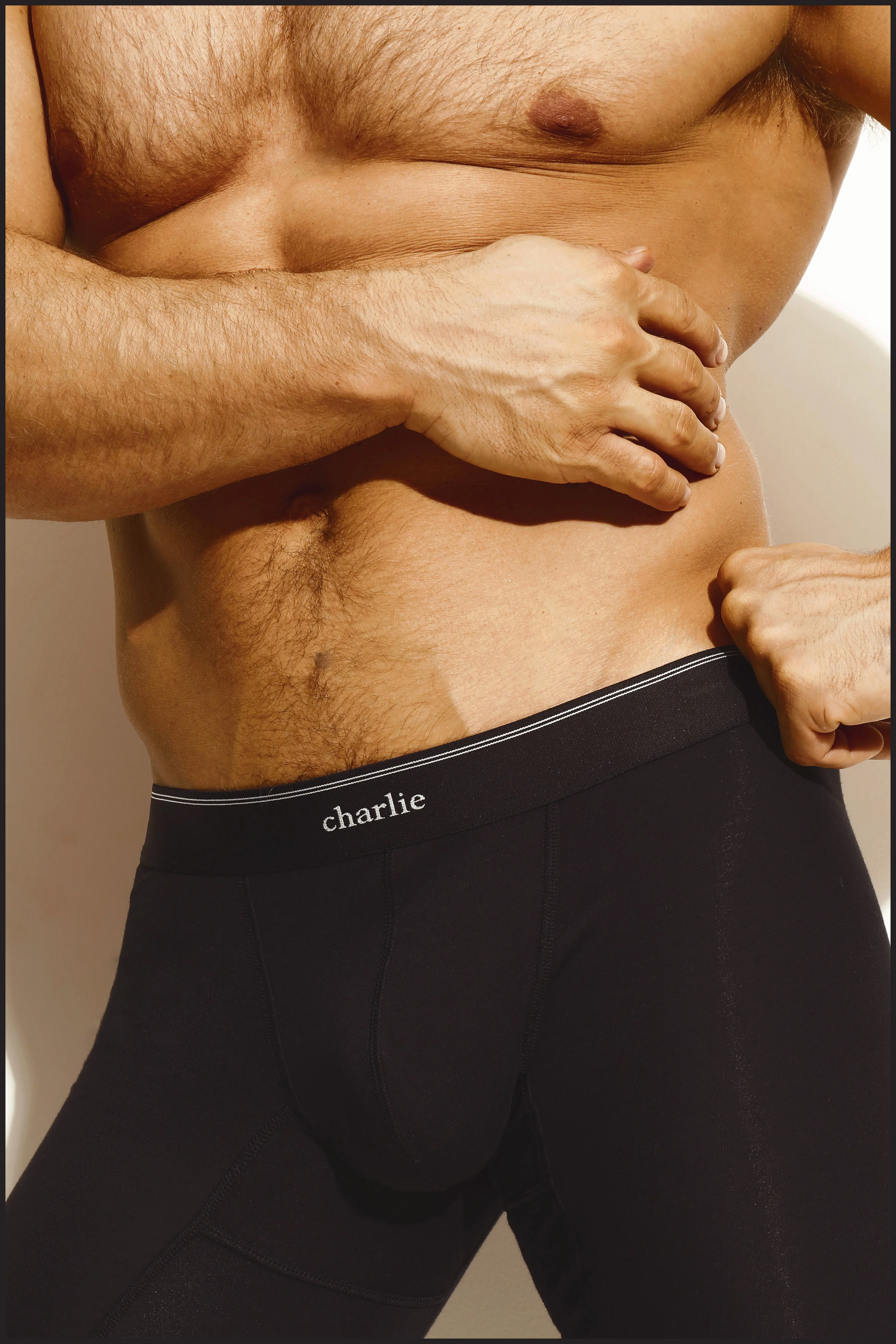 Charlie by Matthew Zink black cotton Fitness Tight with 1 1/2" black logo waistband elastic. Double layer front pouch.