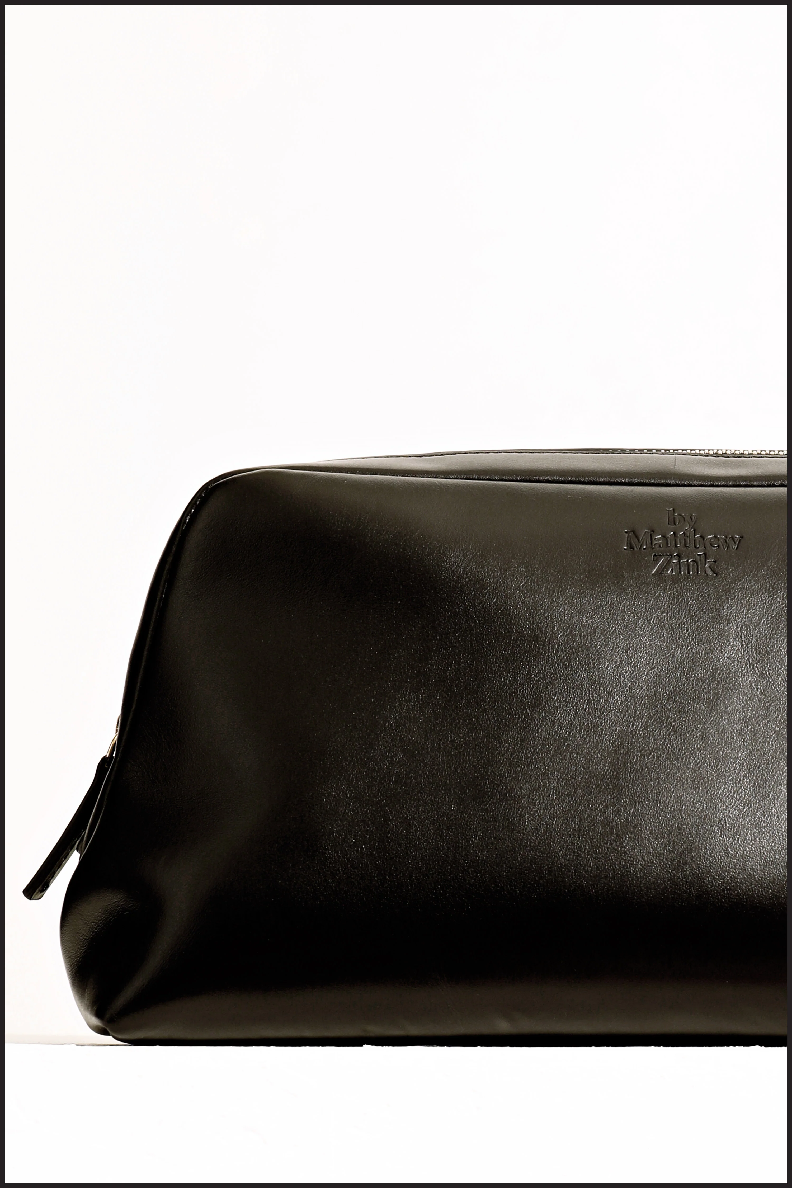 Made in Italy. Supple genuine black Leather Travel Case with “by Matthew Zink” embossed logo, and gold zipper with leather pull. Black Cotton twill lining with inside zip pocket. Machine stitched for durability. Includes a black drawstring cotton storage bag.