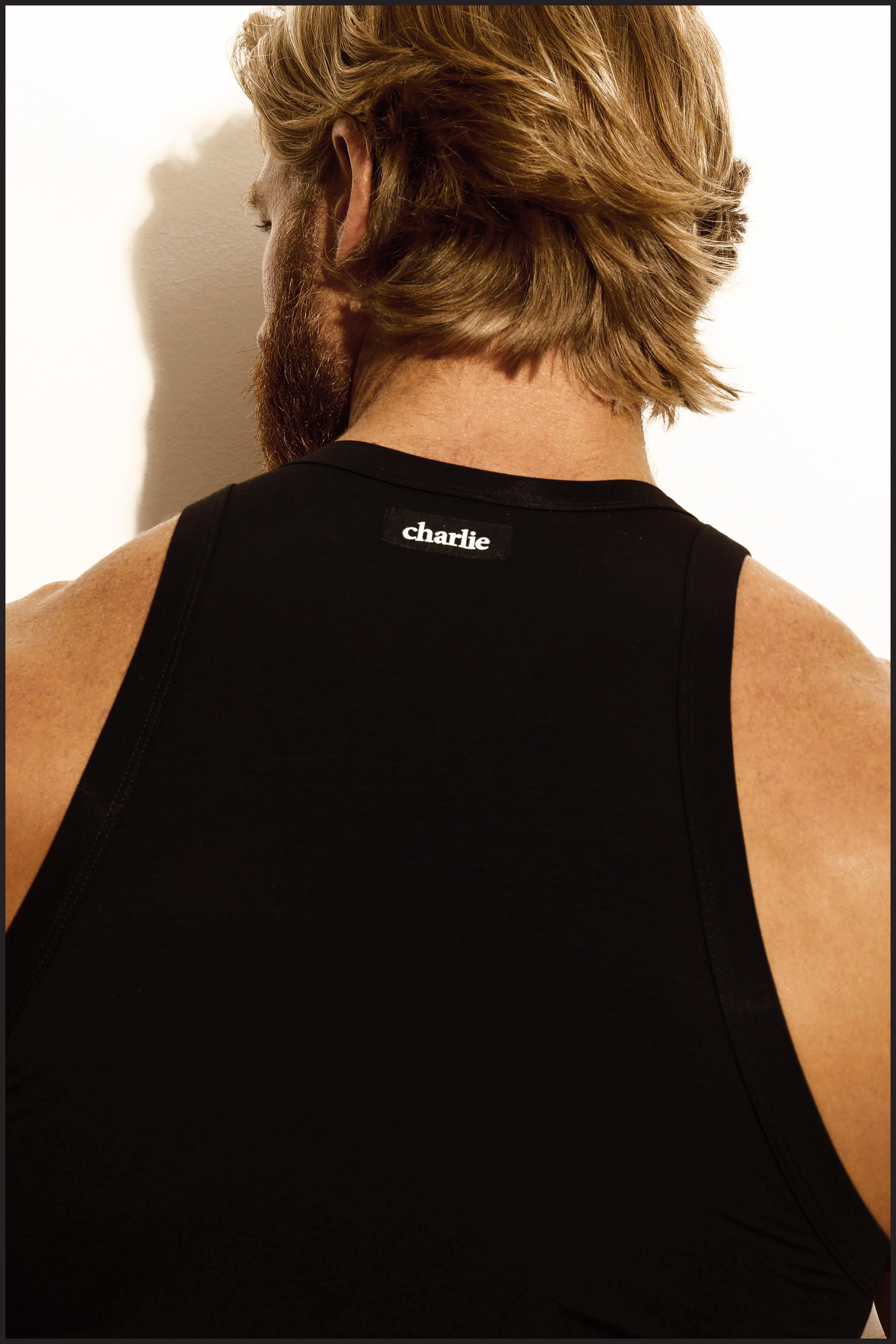 Charlie by Matthew Zink Black Muscle Tank in our Italian featherweight micromodal. Tank has shaped shirt tail hem.