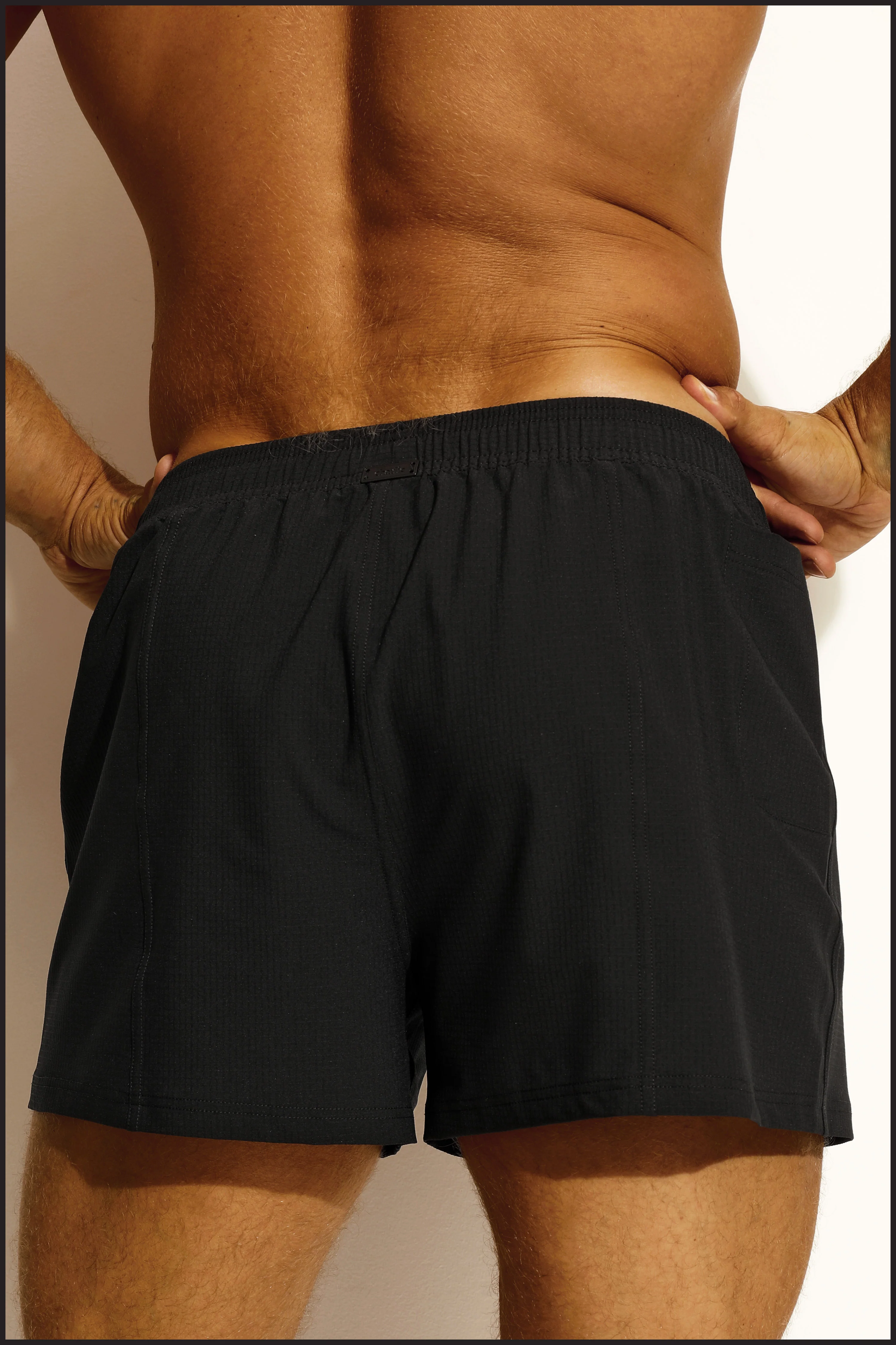 Charlie by Matthew Zink Black ripstop Football Short is unlined with a drawstring waistband and a single right hip cell phone pocket. This Football Short has a similar fit to our Gym Short.
